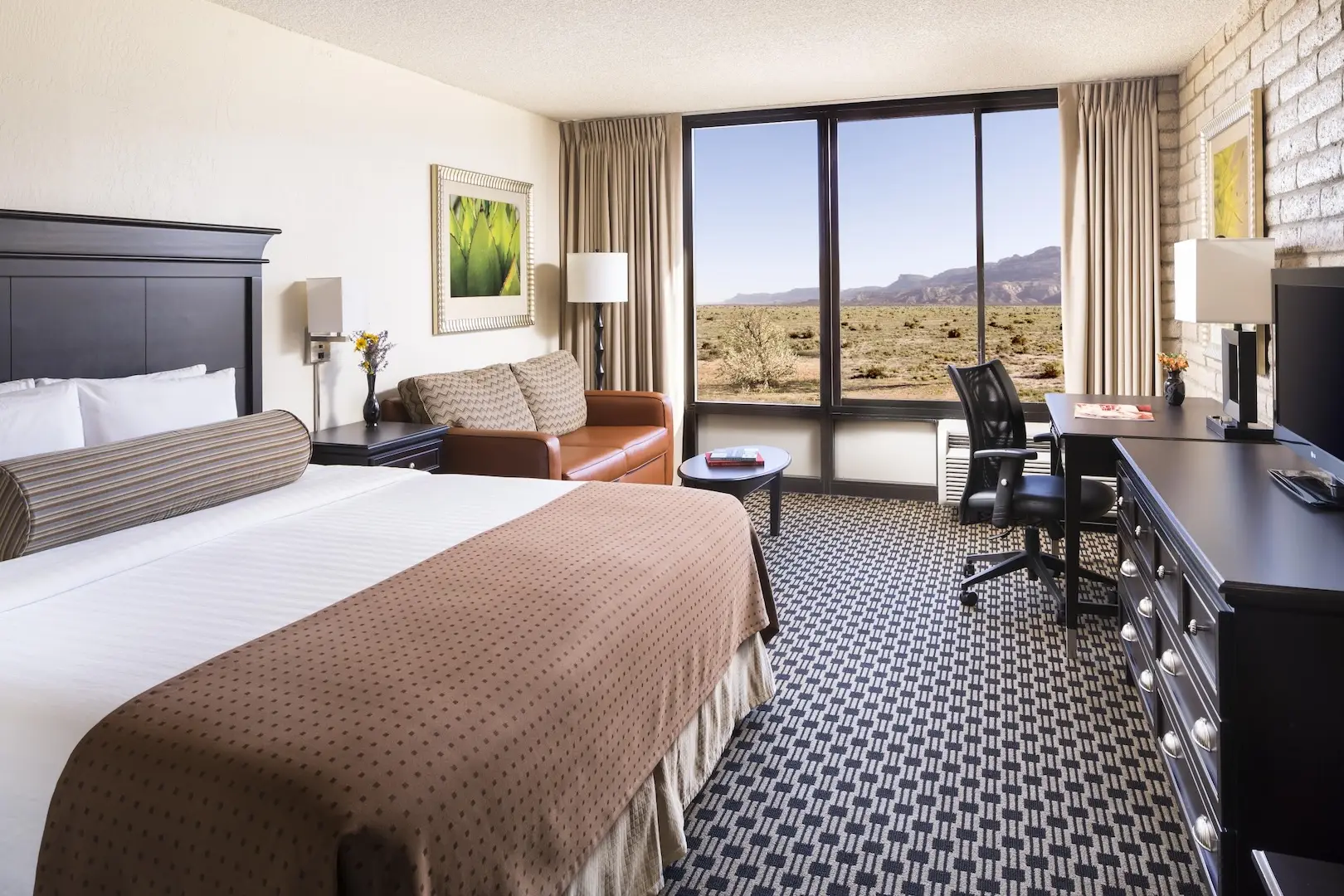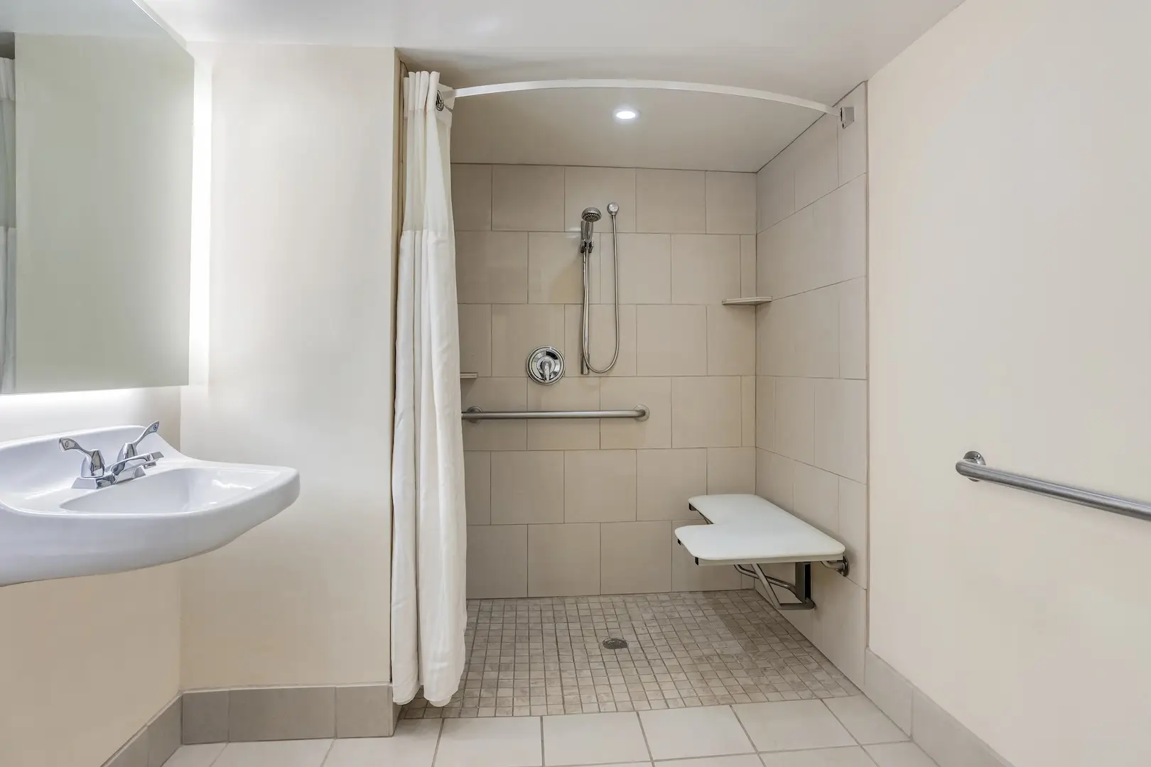 Our ADA guestrooms are designed to be fully accessible for all. Our guestrooms feature lowered light switches and lowered peep holes, roll-in showers and shower wands, shower seat/bench (available upon request), toilet with grab bars, bathroom sink with chair access, and TV with closed captioned explaining all hotel features. Optional communication features for guests with hearing disabilities, which include: visual alarm, visual door knock/doorbell, telephone with volume control, electrical outlet near telephone jack and TTY kit available upon request. These accessible rooms feature a plush King size bed, Flat screen TV with premium channels, wireless internet access, toiletries, coffee & tea station, and ergonomically-designed workspaces with desks and chairs.